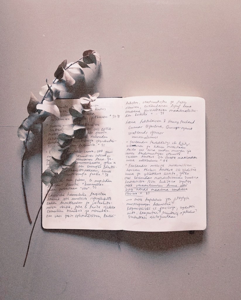 Tarve tulee ja menee kausittain. Välillä on saatava laittaa asioita muistiin jatkuvasti. Luen, syön, keskustelen, kuuntelen ja hengitän kynän ja paperin kanssa. Välillä taas unohdan koko jutun. Ehkä vastaan tulee jotakin merkitsemisen arvoista, mutten vaivaudu tarttumaan siihen. Ajattelen, että muistan kyllä. Osan ehkä muistankin. Osan silti unohdan, juuri sen pienen, joka voisi aikanaan muistuttaa jostakin suuresta.